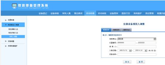 1.如需要变更调整资产领用人,资产管理员可点击“变动申请”中“院处转出入申请”下的“领用人调整”菜单项,并在右侧搜索框内输入“仪器编号”等查询条件搜出需要调整领用人的资产
