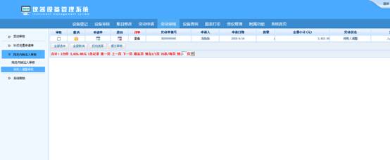 3.单击上图确定后系统将生成领用人变动申请表,将该表格打印一式三份,原领用人,新领用人与资产所在部门负责人在盘点完资产实物后签字,新旧领用人和部门资产管理员各留存一份,再由部门资产管理员进入“变动审核”菜单中,点击“院处内转出入审核”菜单下的“领用人调整审核”选项,左侧方框选中上一步生成的提交申请记录,点击“提交审核”按钮(如下图),部门内领用人交接调整手续即可完成。